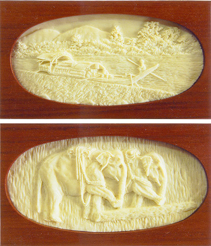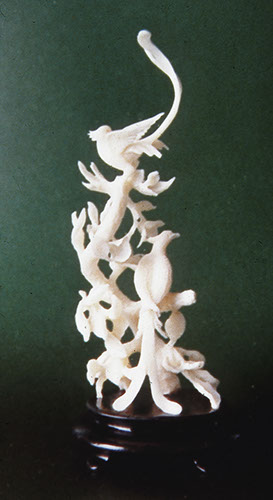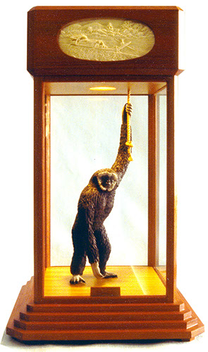 "Sahm" A Gibbon Ape. Carved as a memorial to a family pet in Hawaii. The top has four hand carved ivory panels depicting moments in Sahm's life. - 10" high