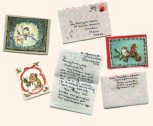 Tiny letters with paintings by Tasha, sent by "Melissa" requesting I make a spinning wheel so she could spin the yarn to make a sweater for Captain Crane. Return address East of the sun west of the moon.