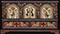 Black lacquered maple carcass tortoise shelled in Indian red with paint and raised gesso designs covered in 24kt gold leaf. Top frieze has a hidden drawer.